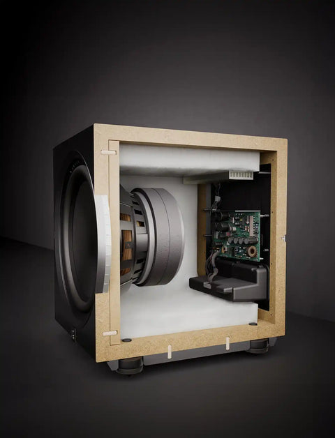 Caja de MDF sellada y fabricada con precisión que presenta una robusta estructura de MDF de 1 pulgada de espesor con deflectores de woofer reforzados y soporte central