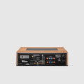 - Los elementos de diseño retro incluyen una carcasa de nogal satinado, medidores VU en el panel frontal, controles de entrada con botones, marca en cursiva de los años 70 y panel frontal gris oscuro